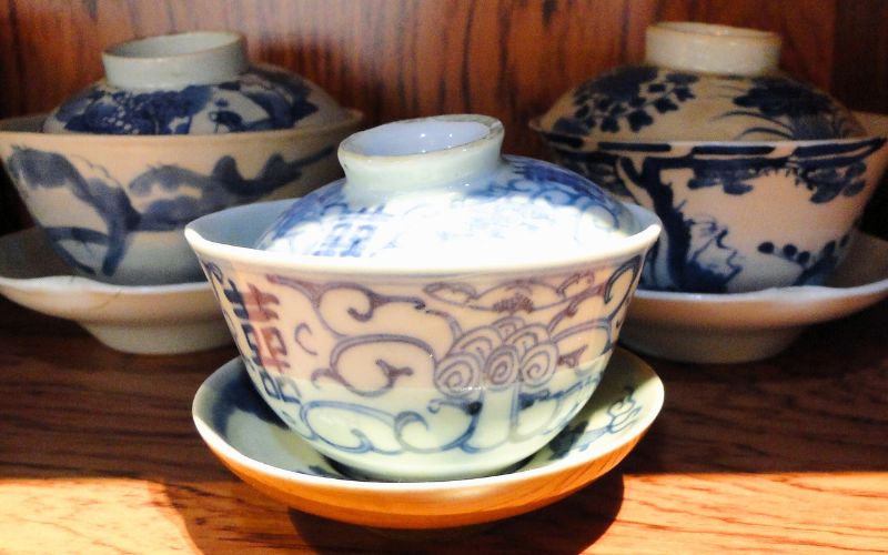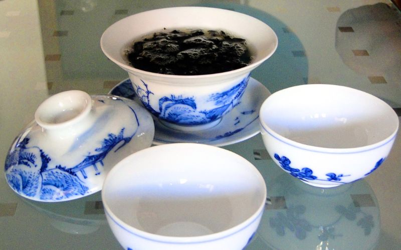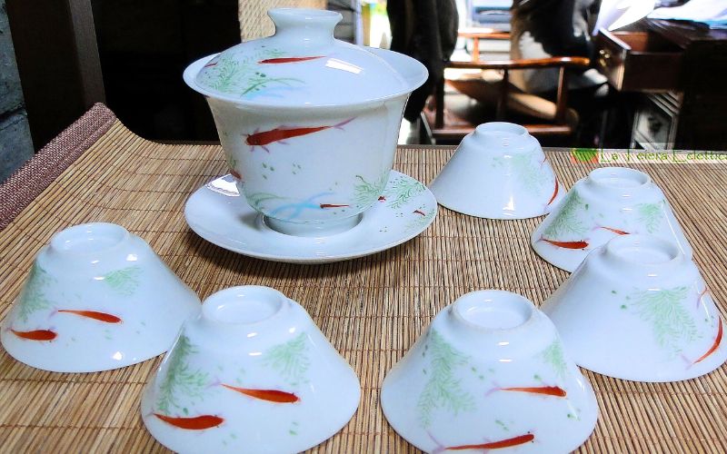 - Gaiwan: tazza con coperchio e piattino, simbolo dell’armonia tra terra, uomo e cielo. Puoi utilizzarla sia come tazza personale che come teiera per servire 4-5 persone. Ideale in porcellana o giada, il vetro è consigliato solo per tè a bassa temperatura. Si usa posando le foglie sul fondo e coprendo con acqua calda. La forma del coperchio è stata concepita in modo che i profumi del tè vengano trattenuti sotto la parte centrale.