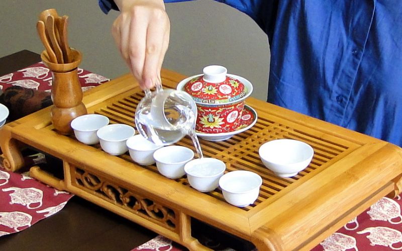 - Versa acqua calda nella gaiwan o nella chahu; attendi che si riscaldino, quindi versala nelle tazzine. Una volta che gli oggetti sono caldi, elimina l’acqua.