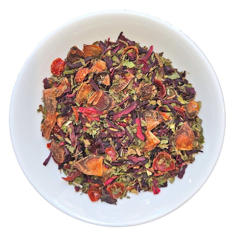 Infuso a base di anice, ibisco, rosa canina e menta. Squisito sia caldo che fresco. Gusto: Le note frizzanti/acidule si incontrano con la freschezza della menta con un finale morbido. Ingredienti: pezzi di anice stellato, petali di ibisco (Hibiscus sabdariffa), rosa canina, foglie di menta. Tutti gli ingredienti da agricoltura biologica.