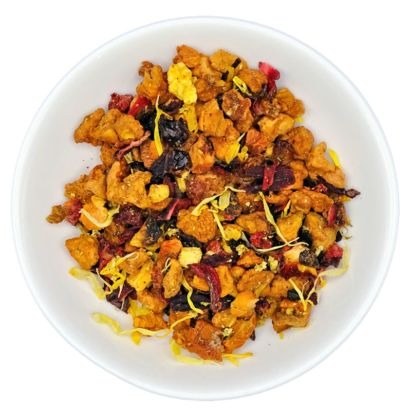 Infuso con ananas e cocco. Squisito sia caldo che fresco. Gusto: le note acidule di ananas e arancia sono addolcite dal cocco e dalla mela. Ingredienti: pezzi di mela, petali di ibisco, scorze d’arancia, rosa canina, pezzi di ananas (ananas, zucchero, acido citrico), fiocchi di cocco, aromi.
